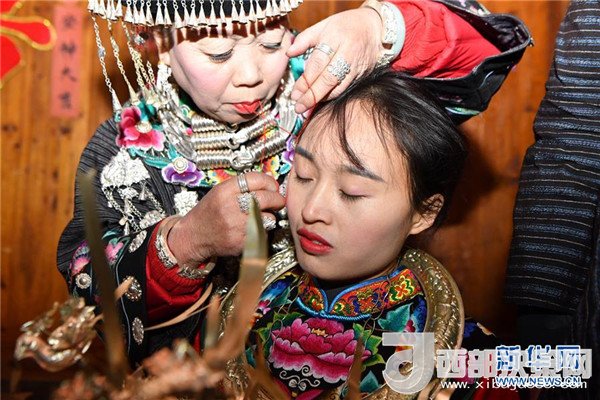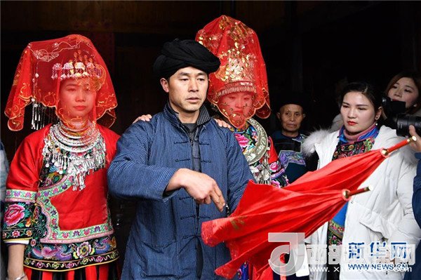 2月4日,在發(fā)親前,婚禮主持人手持紅傘為她們祈福。苗族人婚禮時(shí)用紅傘代替紅蓋頭,傘與“散”諧音,取開枝散葉之意,同時(shí)傘能為人遮風(fēng)避雨,寓意為新娘遮風(fēng)擋雨。