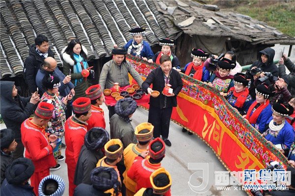 2月4日,在湖南省湘西土家族苗族自治州花垣縣十八洞村,新娘的親友為接親隊(duì)伍倒上攔門酒。