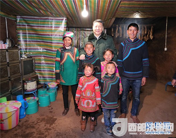 這是習(xí)近平在涼山彝族自治州昭覺縣三岔河鄉(xiāng)三河村同貧困戶吉好也求一家合影。記者 謝環(huán)馳 攝