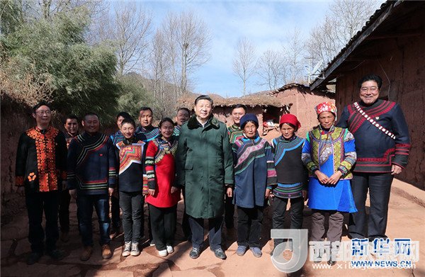 這是習(xí)近平在涼山彝族自治州昭覺縣三岔河鄉(xiāng)三河村貧困戶節(jié)列俄阿木家同鄉(xiāng)親們合影。記者 謝環(huán)馳 攝