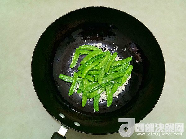 6.爆出香味后放入瀝干水分的荷蘭豆翻炒片刻