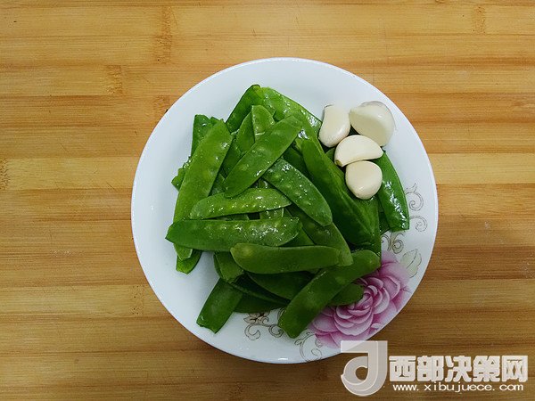 1.荷蘭豆去蒂清洗干凈,大蒜去皮。