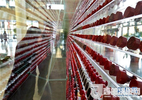市民在河北邯鄲市行政審批局公章封存展示墻前駐足觀看(1月9日攝)。