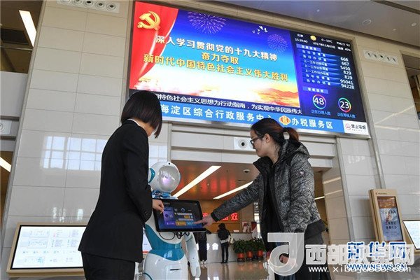在北京市海淀區(qū)綜合行政服務(wù)中心,工作人員(左)向一名女士介紹智能引導(dǎo)機(jī)器人的使用方法(2017年11月3日攝)。 新華社記者申宏攝