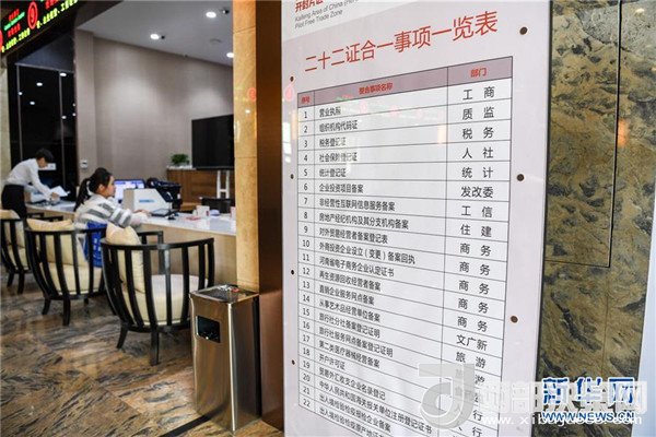 河南自貿(mào)區(qū)開封片區(qū)綜合服務(wù)中心內(nèi)的“二十二證合一事項(xiàng)一覽表”(2017年6月16日攝)。新華社記者李博攝