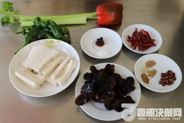 主料:豆腐 230克   西芹 50克   青椒 80克   大辣椒 110克   干辣子 7克   木耳 65克