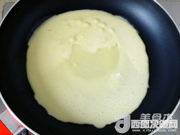 6.舀一勺面糊輕輕倒入鍋中,待表面起泡,邊緣熟后,晃動(dòng)鍋,整個(gè)面餅都不沾在鍋底了說明一面煎好了,可以抖一下鍋翻面