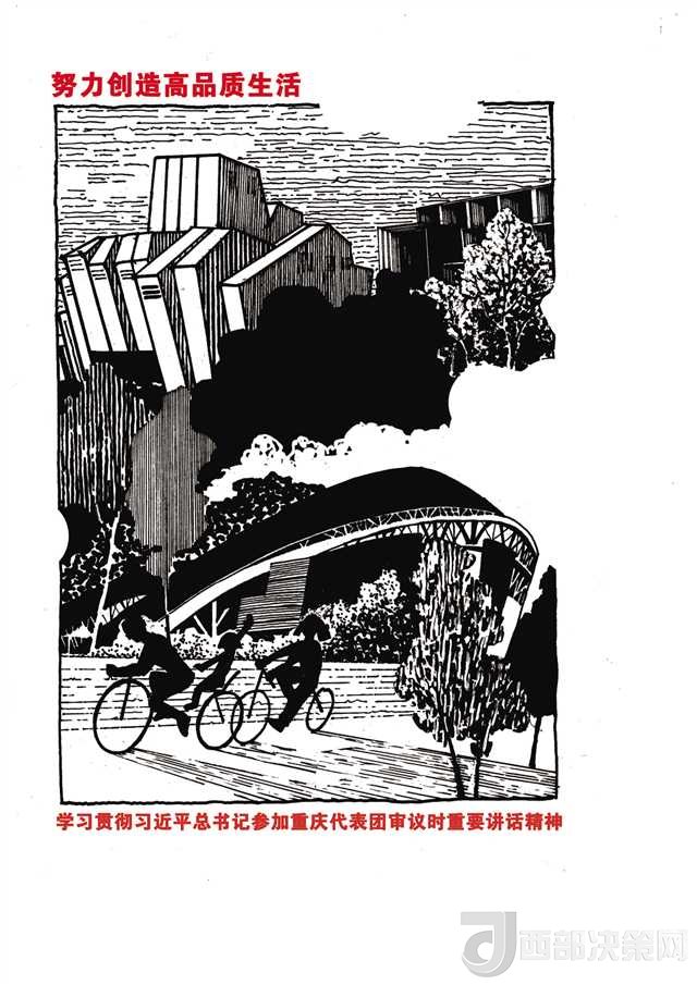 另一組負責“創(chuàng)造高品質生活”的師生也遭遇類似的問題。最初師生們想用一組市民在公園鍛煉的場景來闡述這個主題,但很快就發(fā)現(xiàn)這樣的畫面太簡單蒼白。最終,他們將重慶大劇院、重慶美術館、奧體中心等重慶的標志性建筑作為文化符號列入畫稿中,才有了令人耳目一新的感覺。