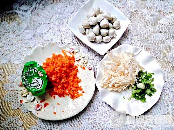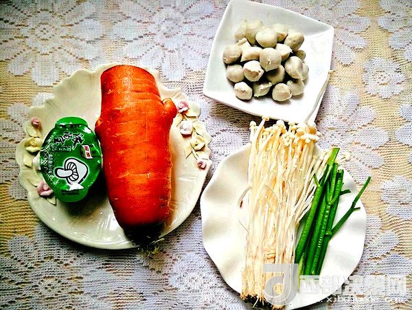 主料:胡蘿卜 半個   金針菇 60克   肉丸 50克   蔥 少許