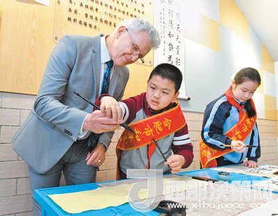 日前,加拿大溫哥華公立教育局考察團(tuán)走進(jìn)安徽省合肥市和平小學(xué)參加中外文化交流活動(dòng),親身體驗(yàn)書法、民樂(lè)和戲曲等傳統(tǒng)文化課程,零距離感受中國(guó)文化的魅力。圖為加拿大客人和和平小學(xué)的學(xué)生們一起學(xué)習(xí)書法。