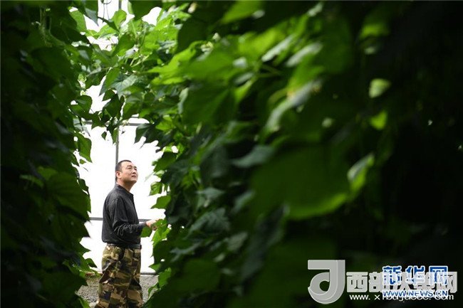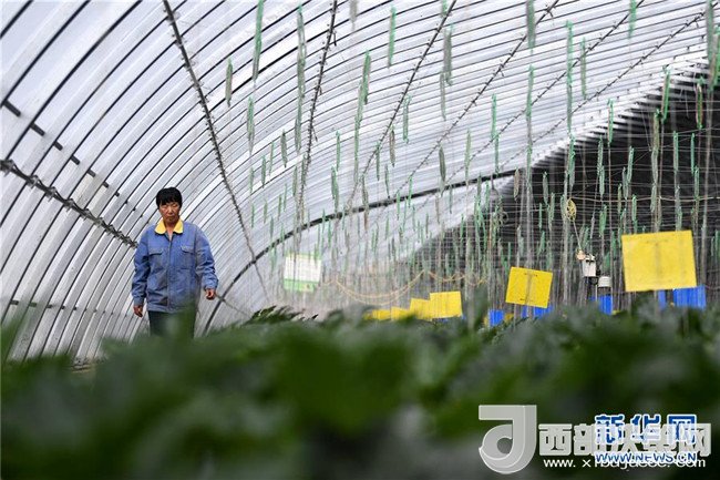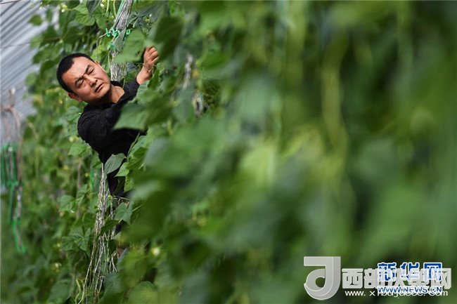 4月18日,村民孔景云在甘肅省酒泉市肅州區(qū)總寨戈壁農(nóng)業(yè)產(chǎn)業(yè)園的日光溫室內(nèi)查看蔬菜生長(zhǎng)情況。