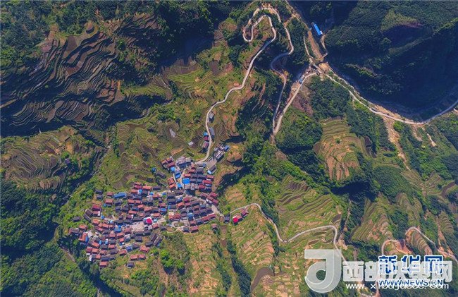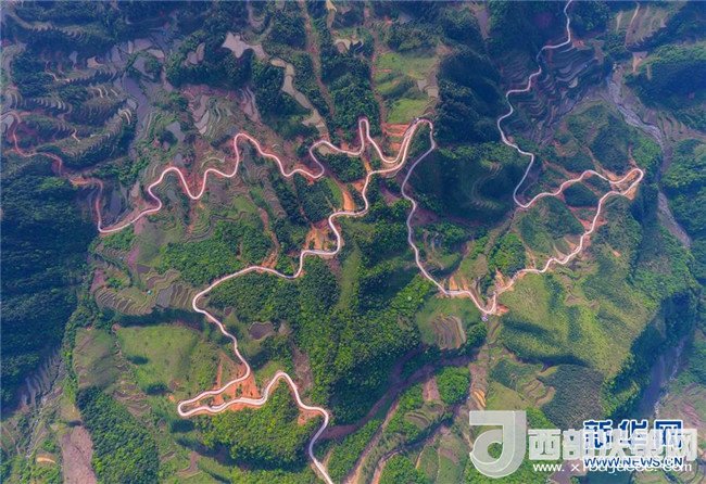 這是借助無(wú)人機(jī)拍攝的融水苗族自治縣桿洞鄉(xiāng)錦洞村公路(4月17日攝)。