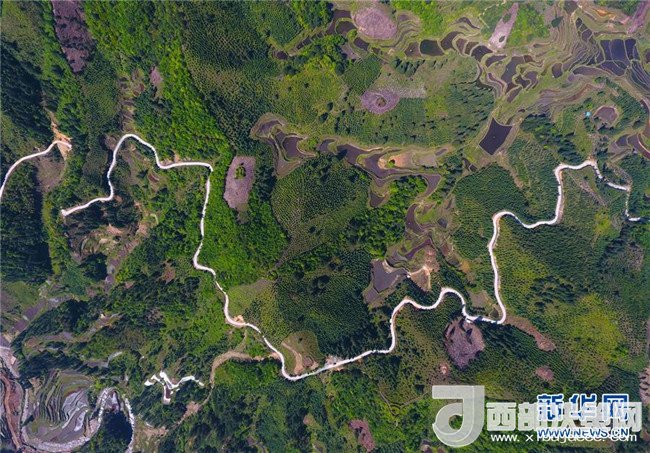 這是借助無(wú)人機(jī)拍攝的融水苗族自治縣桿洞鄉(xiāng)花孖村公路(4月17日攝)。