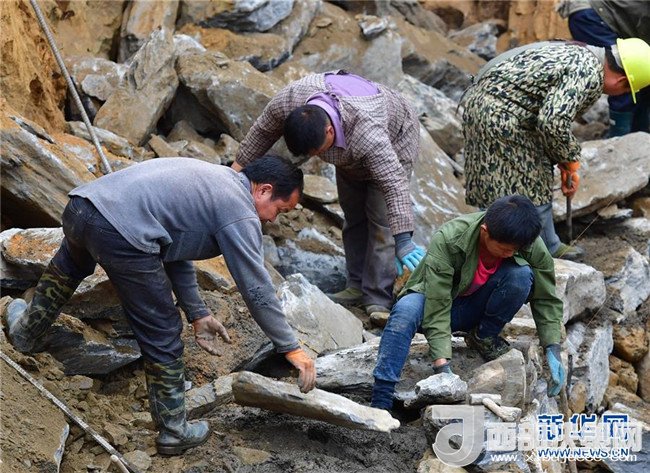 工人在融水苗族自治縣桿洞鄉(xiāng)花孖村維修公路(3月27日攝)。