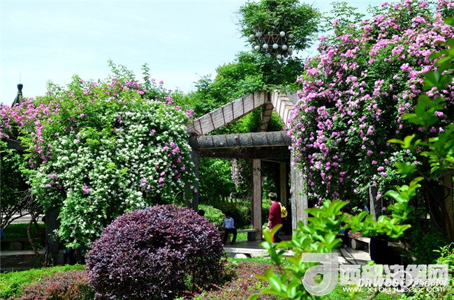 5月1日,市民正在寧強縣縣城三角洲公園里的薔薇花下納涼賞花。