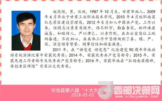 西部決策網(wǎng)——西部大開(kāi)發(fā)訊(帥華鋒 張曉紅 通訊員 陳彥榮 柴金霞)5月3日,在南梁法官教育基地講法堂,華池團(tuán)縣委隆重召開(kāi)紀(jì)念“五四”運(yùn)動(dòng)99周年暨第六屆“十大杰出青年”表彰大會(huì)。甘肅南梁革命紀(jì)念館趙高銪同志榮獲華池縣第六屆“十大杰出青年”榮譽(yù)稱號(hào)。
