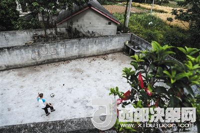 周末回家的一名小球員在自家門口的空地上對著墻上的靶環(huán)練習(xí)腳法。