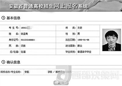 2008年,安徽考生徐孟南第一次參加高考,他并沒有“規(guī)矩”答題,而是在考卷上寫滿了自己的“教育宣言”。最終,總分160多分的成績沒能將他送進(jìn)任何一所高校,徐孟南也被稱為“白卷考生”。其實(shí),10年前高考之后不久,他便后悔了自己的選擇。在此后的10年間,他都未能再次回到考場。今年3月,徐孟南參加了安徽省普通高校分類招生考試,被一所大專院校錄取。近日,他收到了學(xué)校的錄取通知書。