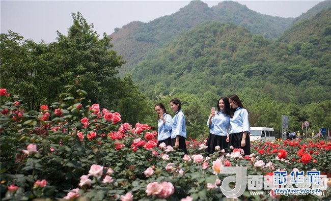 來(lái)自成都的大學(xué)生在位于四川綿竹市的“中國(guó)玫瑰谷”游覽拍照(4月18日攝)。新華社記者 張帆 攝