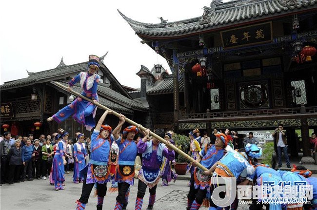 演員在汶川縣水磨鎮(zhèn)萬(wàn)年臺(tái)進(jìn)行民俗表演(2012年5月23日攝)。新華社發(fā)(王飛 攝)