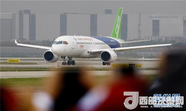 中國(guó)首款國(guó)際主流水準(zhǔn)的干線客機(jī)C919在上海浦東國(guó)際機(jī)場(chǎng)首飛成功(2017年5月5日攝)。新華社記者方喆攝