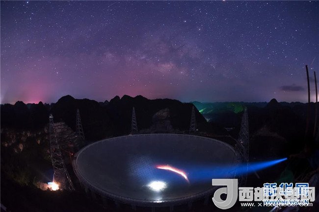 FAST在滿天繁星下呈現(xiàn)出的美麗景觀(2016年6月27日攝)。2017年10月10日,中國(guó)科學(xué)院國(guó)家天文臺(tái)宣布,被譽(yù)為“中國(guó)天眼”的500米口徑球面射電望遠(yuǎn)鏡(FAST)經(jīng)過(guò)一年緊張調(diào)試,已實(shí)現(xiàn)指向、跟蹤、漂移掃描等多種觀測(cè)模式的順利運(yùn)行,并確認(rèn)了多顆新發(fā)現(xiàn)脈沖星。新華社記者劉續(xù)攝