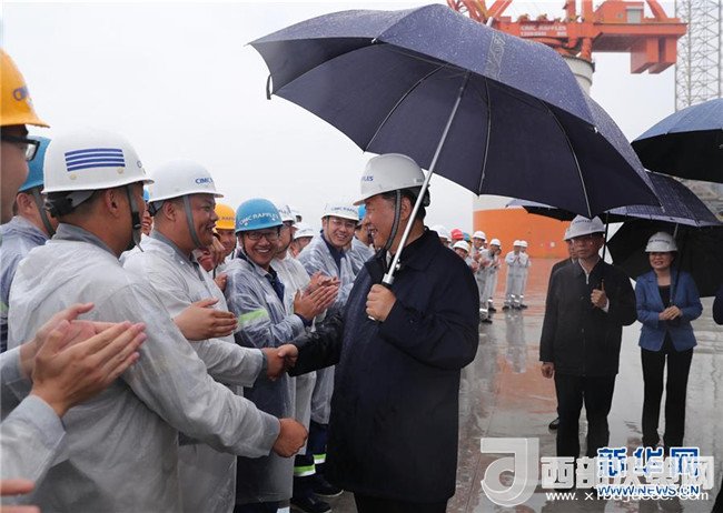 風(fēng)急云低,雨流如注。13日下午,習(xí)近平來到中集來福士海洋工程有限公司煙臺基地。作為國內(nèi)率先進(jìn)入海洋工程行業(yè)的企業(yè),中集來福士用10年左右時間,國產(chǎn)化率從不足10%提高到60%。在廠區(qū)碼頭上,習(xí)近平撐著雨傘,趟著積水,近距離察看停靠在這里的自升式修井生活平臺,遠(yuǎn)眺“藍(lán)鯨1號”超深水雙鉆塔半潛式鉆井平臺、“泰山”龍門吊、海洋牧場平臺,向企業(yè)負(fù)責(zé)人詳細(xì)了解高端海洋工程設(shè)備制造、維護(hù)、運(yùn)行情況。海風(fēng)吹起了衣襟,雨水打濕了褲腿。習(xí)近平站在雨中,同圍攏過來的工人們一一握手、親切交談,向作業(yè)平臺上的工人們揮手致意。習(xí)近平指出,國有企業(yè)特別是中央所屬國有企業(yè),一定要加強(qiáng)自主創(chuàng)新能力,研發(fā)和掌握更多的國之重器。國有企業(yè)要深化改革創(chuàng)新,努力建成現(xiàn)代企業(yè)。要堅(jiān)持黨對國有企業(yè)的領(lǐng)導(dǎo)不動搖,堅(jiān)持建強(qiáng)國有企業(yè)基層黨組織不放松,為做強(qiáng)做優(yōu)做大國有企業(yè)提供堅(jiān)強(qiáng)組織保證。