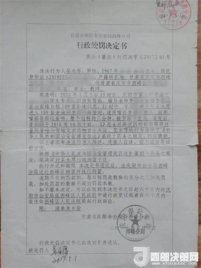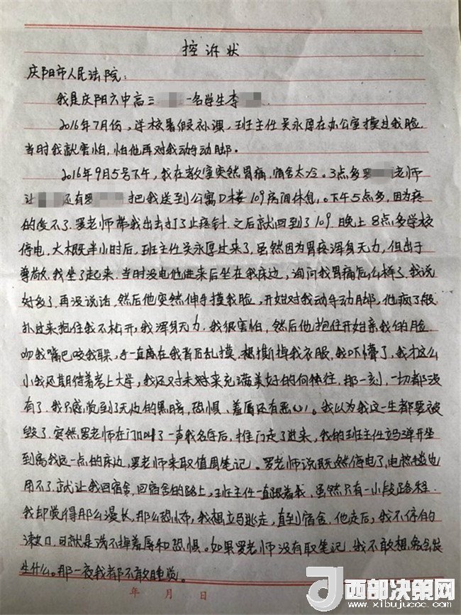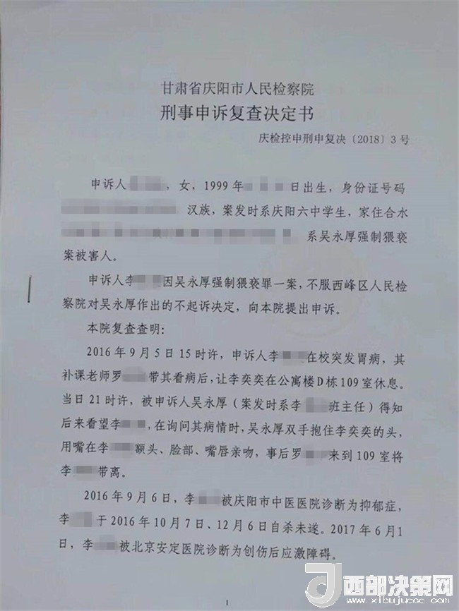 孩子叫李某奕,1999年4月出生,原慶陽六中高三(二)班學(xué)生,平時(shí)活潑開朗,勤奮好學(xué),成績?cè)诎嗉?jí)前列。然而,噩夢(mèng)從2016年9月開始了。2016年9月5日下午,當(dāng)時(shí)正在慶陽六中讀高三的李某奕突然胃疼,因?yàn)樗奚岜容^冷,被老師安排在教師公寓休息。晚上8點(diǎn)半左右,班主任吳某厚以探病為由進(jìn)入女兒休息的房間,詢問過后便開始摸臉、親吻、咬耳朵、摟抱李某奕,后因安排她休息的老師進(jìn)房間取東西才停止。此后她心里就有了陰影。她先找到學(xué)校心理輔導(dǎo)老師哭訴了自己的遭遇,心理輔導(dǎo)老師解決不了,又告訴了政教主任段老師。交談中段主任得知孩子的訴求是不想見到這位涉事老師,就答應(yīng)其要求。并肯定了孩子沒告訴家長是對(duì)的。