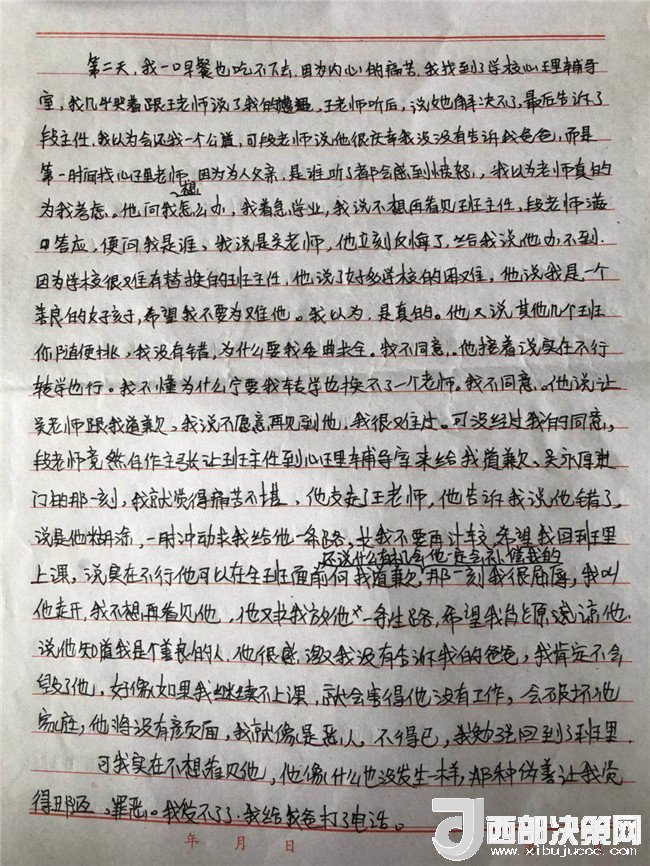 后來,當(dāng)段主任得知這位老師是吳某厚時(shí),馬上開始訴苦,學(xué)校有困難他辦不到,轉(zhuǎn)班轉(zhuǎn)學(xué)都可以。并在孩子不知情的情況下叫來了吳某厚跟孩子道歉。“在沒有經(jīng)過我女兒同意,在沒有人陪護(hù)的情況下,讓當(dāng)事人給我女兒道歉去了。后來女兒有一次生氣地的講,哪是道歉,就是來威脅我!我就想小孩本來7月份有一次,9月份發(fā)生這事(猥褻),孩子很無助的找心理輔導(dǎo)老師,找學(xué)校,那你還敢讓她單獨(dú)去面對(duì)我女兒,我都在想,學(xué)校哪來的那么大膽讓她兩單獨(dú)去見!”李某奕父親憤怒的說。