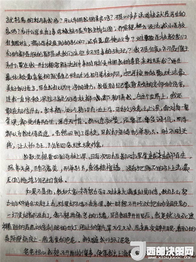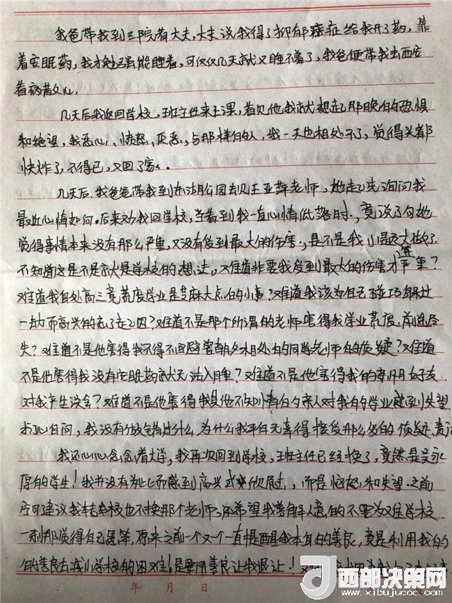 孩子的病情一直不見好轉(zhuǎn),主治醫(yī)生和心理輔導(dǎo)老師都說要打開孩子的心結(jié),而孩子的心結(jié)就在學(xué)校一直沒有給她一個(gè)公正的說法。在斷斷續(xù)續(xù)上學(xué)過程中,他多次找過學(xué)校。起初學(xué)校還和他談,后來學(xué)校說他們是組織教學(xué)的地方,處理教師的事管不了,要找教育局,直接就不理他了。再后來他連門都進(jìn)不去了。