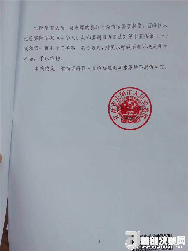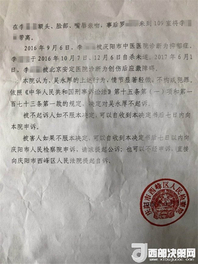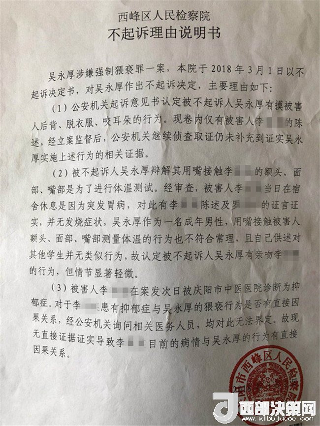 2017年2月26日,李某奕在父親陪同下到公安機(jī)關(guān)報(bào)案,稱被其班主任吳某厚猥褻,要求查處。經(jīng)辦案部門調(diào)查,2017年5月2日,公安機(jī)關(guān)依據(jù)《中華人民共和國治安管理處罰法》第四十四條之規(guī)定,以猥褻行為對(duì)吳某厚處以行政拘留十日處罰。其間,李某奕父親認(rèn)為公安局處罰不當(dāng),到西峰區(qū)人民檢察院進(jìn)行申訴。區(qū)檢察院調(diào)閱案卷后認(rèn)為吳某厚的行為涉嫌犯罪,書面通知公安局立案?jìng)刹?。公安局?017年8月10日立為刑事案件。8月25日對(duì)吳某厚采取取保候?qū)彺胧?1月20日偵查終結(jié)后移送起訴至區(qū)檢察院。區(qū)檢察院審查后認(rèn)為吳某厚的行為“情節(jié)顯著輕微,不構(gòu)成犯罪”,“決定對(duì)吳某厚不起訴”,并出具《不起訴理由說明書》。提出不起訴的三個(gè)理由,包括“公安機(jī)關(guān)繼續(xù)偵查取證仍未補(bǔ)充到吳某厚實(shí)施上述行為的相關(guān)證據(jù)”、“吳某厚有親吻李某奕的行為,但情節(jié)顯著輕微”、“無直接證據(jù)證實(shí)導(dǎo)致李某奕目前的病情與吳某厚的行為有直接因果關(guān)系”,于2018年3月1日作出不起訴決定。李某奕遂到慶陽市人民檢察院進(jìn)行申訴。5月18日,市檢察院維持區(qū)檢察院不起訴決定。6月25日晚,據(jù)李某奕父親講,他已將申訴材料寄至甘肅省人民檢察院。