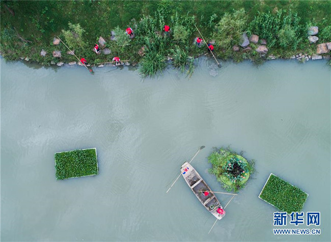 在浙江省長興縣劉家渡河道南太湖段,河長帶領(lǐng)專職保潔人員進(jìn)行日常鄉(xiāng)村河道護(hù)理(2017年10月13日無人機(jī)拍攝)。