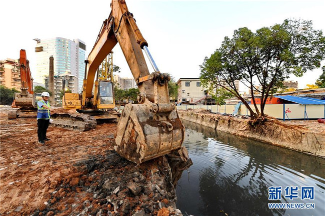 福建省福州市鼓臺(tái)中心區(qū)水系綜合治理點(diǎn)達(dá)道河河長溫水林在指揮工人進(jìn)行河道新建截污管的回填(2017年10月11日攝)。
