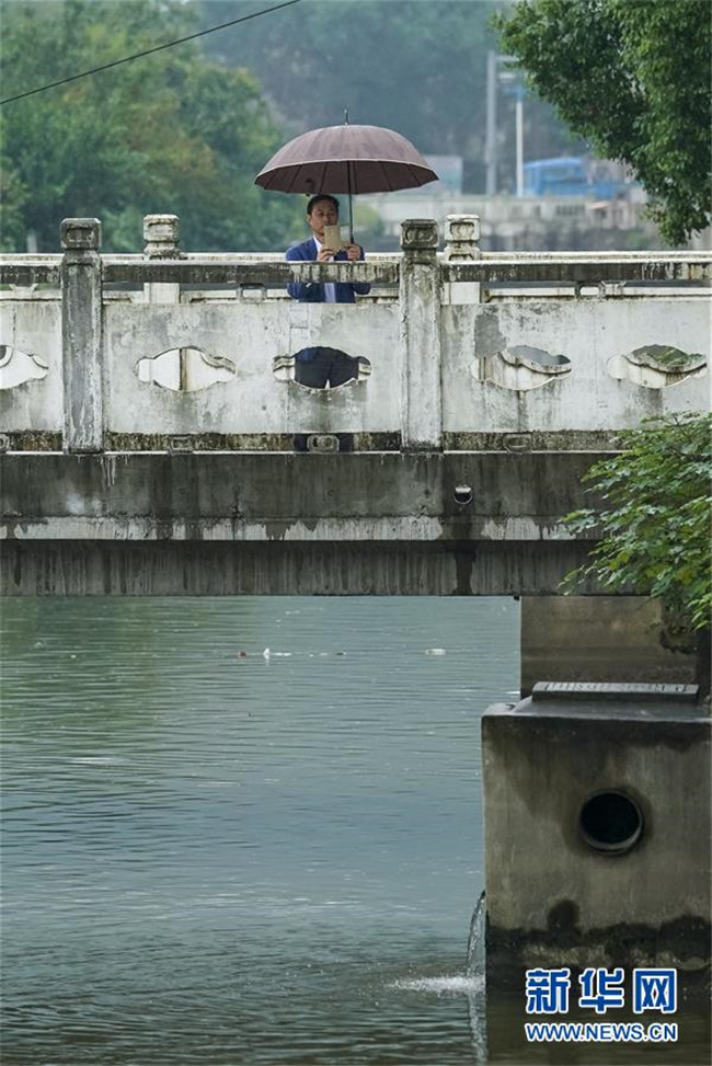 在江蘇省無錫市濱湖區(qū)馬山街道西村社區(qū),顧家瀆河河長鈕建春在巡查村中河道時(shí)拍攝雨水出水口情況(2017年10月12日攝)。