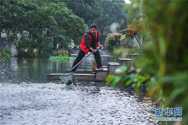 在浙江省長興縣龍山街道渚山村車渚港河道內(nèi),河長王佳進(jìn)行日常鄉(xiāng)村河道護(hù)理巡查(2017年10月12日攝)。