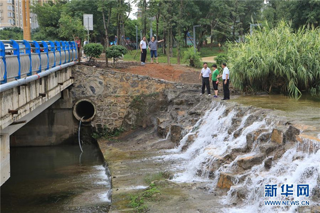 貴州省興義市桔山河的市級(jí)河長葛佳華(右二)與鎮(zhèn)級(jí)、村級(jí)河長對(duì)桔山河沿線一處排污管道進(jìn)行巡查(2018年7月15日攝)。