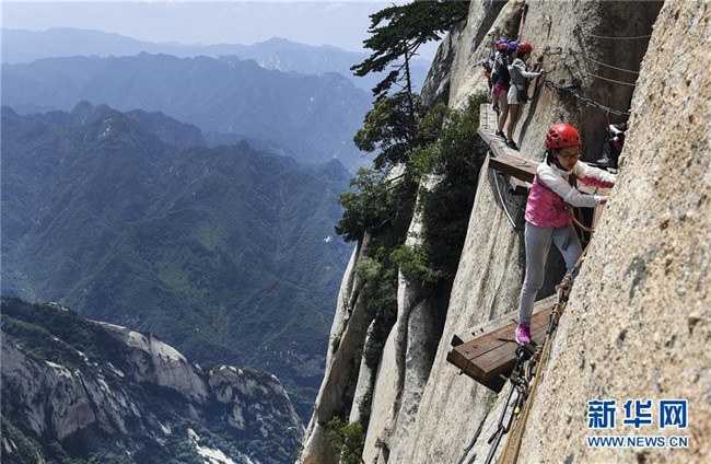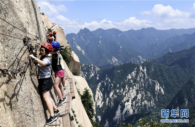 7月18日,游人通過華山長空棧道。