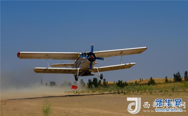 在內(nèi)蒙古鄂爾多斯市的庫布其沙漠腹地,一架飛播造林用的飛機起飛(7月11日攝)。 新華社記者 彭源 攝