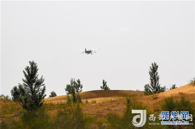 在內(nèi)蒙古鄂爾多斯市的庫布其沙漠腹地,一架飛播造林用的飛機飛向沙海(7月11日攝)。 新華社記者 彭源 攝