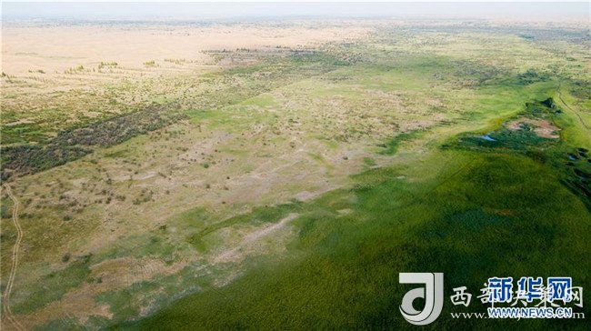 這是內(nèi)蒙古鄂爾多斯市杭錦旗庫布其沙漠中的生態(tài)修復現(xiàn)狀(7月11日無人機拍攝)。 新華社記者 彭源 攝