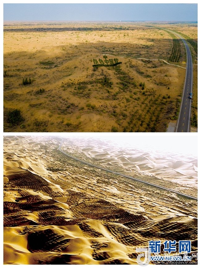 這是內(nèi)蒙古鄂爾多斯市杭錦旗庫布其沙漠穿沙公路周邊環(huán)境的對比(拼版照片:上為2018年7月11日新華社記者彭源攝;下為資料照片)。 新華社發(fā)