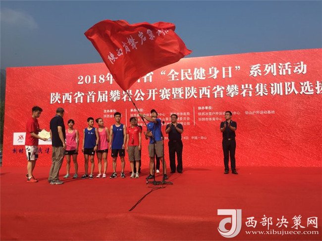 隨后陜西省登山協(xié)會(huì)主席陳錚向省攀巖集訓(xùn)隊(duì)教練組代表邱洪樹授“陜西省攀巖集訓(xùn)隊(duì)”隊(duì)旗,并頒發(fā)聘書。陜西省社會(huì)體育管理中心主任田凱、渭南市體育局副局長王曉燕、陜西華山旅游集團(tuán)有限公司副總經(jīng)理趙江峰同志共同為“陜西省攀巖訓(xùn)練基地”揭牌。