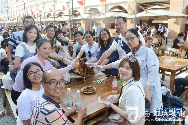 8月18日,來(lái)自上海等地的游客在烏魯木齊二道橋大巴扎步行街品嘗烤全羊。