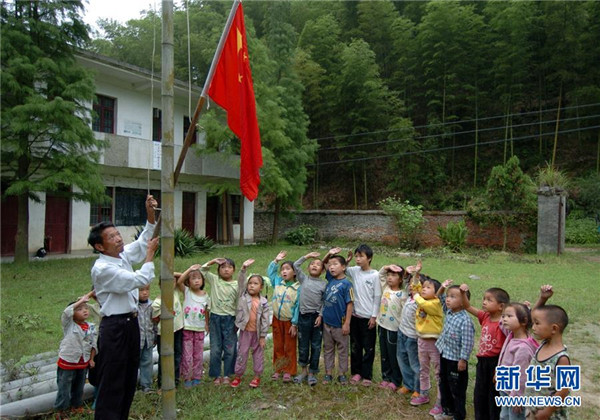 9月4日,在蘆嶺教學(xué)點,陳云根(后)和黃文春(前)帶著全校6名學(xué)生升國旗?,F(xiàn)在學(xué)校操場已經(jīng)鋪上了水泥。新華社記者 宋振平 攝