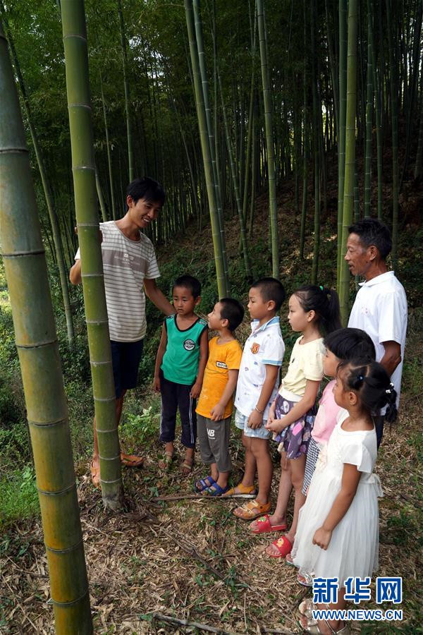 9月4日,黃文春(左一)和陳云根帶著學(xué)生們來到學(xué)校附近的山林,為孩子們講解竹子的生長過程。  新華社記者 汪明麗 攝