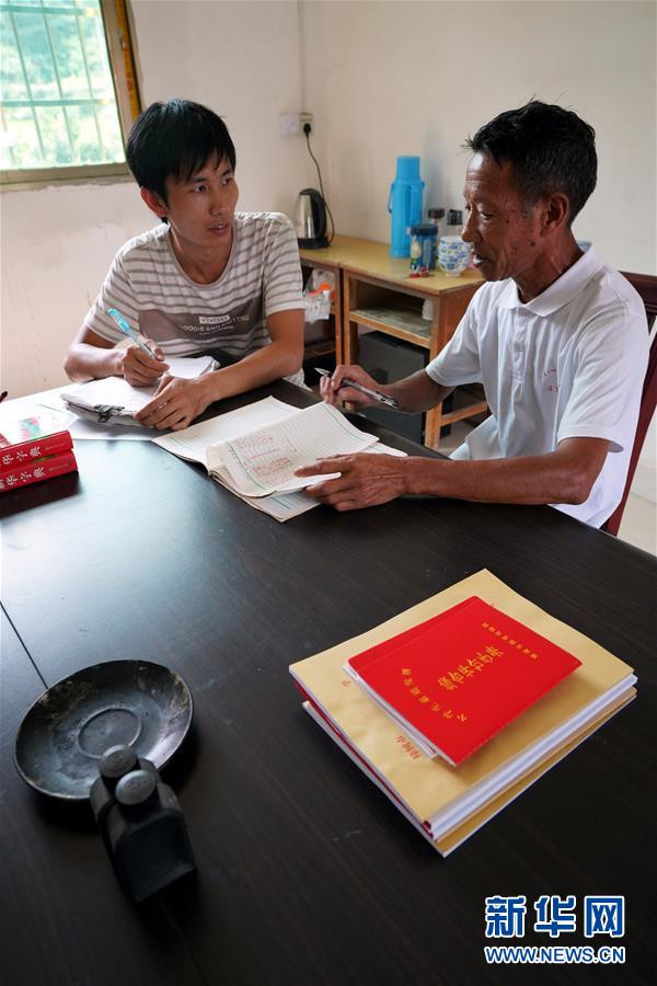 9月4日,在蘆嶺教學(xué)點,陳云根(右)與黃文春探討新學(xué)期教學(xué)計劃。 新華社記者 宋振平 攝