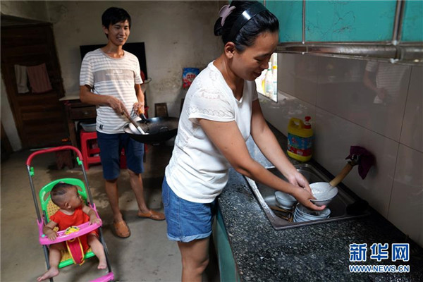 9月4日,在黃文春家中,黃文春和妻子歐陽沙在廚房做飯。黃文春2011年與同學(xué)歐陽沙結(jié)婚后,就把根扎在了蘆嶺,幾次放棄了考試進(jìn)城教書的機(jī)會。  新華社記者 宋振平 攝