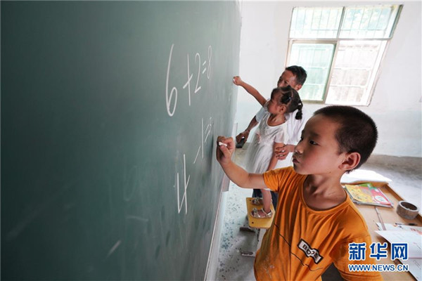 9月4日,在蘆嶺教學(xué)點,陳云根在課堂上帶著孩子們做習(xí)題。  新華社記者 宋振平 攝