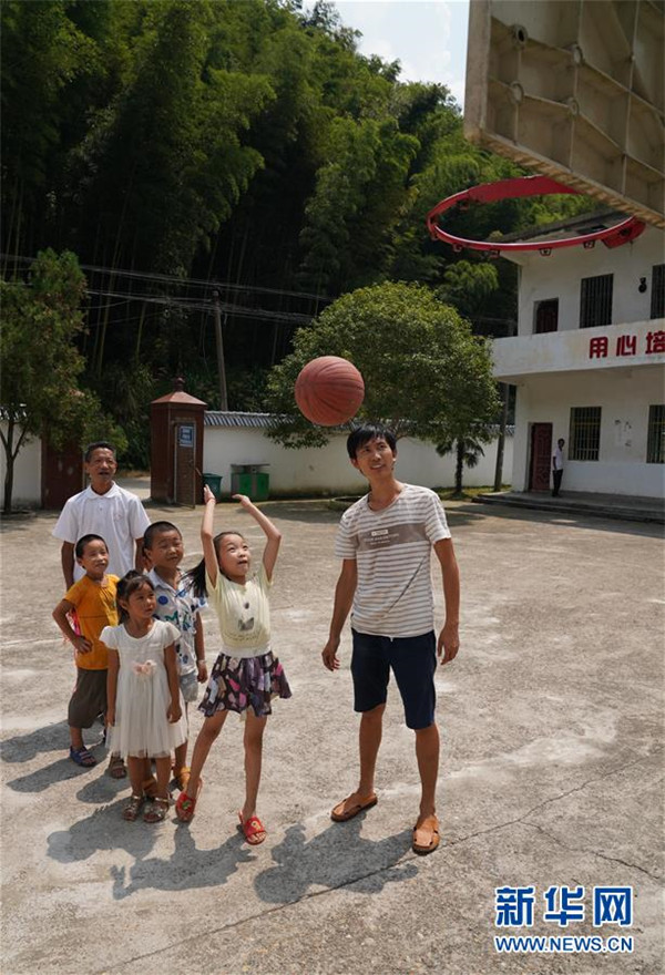 9月4日,在蘆嶺教學(xué)點,陳云根(左一)和黃文春(右一)帶著孩子們上體育課。  新華社記者 宋振平 攝
