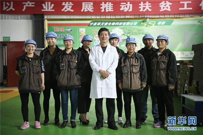 潘文賢(前排中)在寧夏固原市隆德縣隆德人造花工藝有限公司與企業(yè)員工合影(8月29日攝)。來自福建南安市的潘文賢2011年在隆德縣創(chuàng)辦隆德人造花工藝有限公司,成為隆德縣第一家集研發(fā)、生產(chǎn)和銷售于一體的勞動(dòng)密集型出口創(chuàng)匯企業(yè),產(chǎn)品遠(yuǎn)銷歐美及東南亞等國家和地區(qū)。截至2017年底,已成功打造隆德縣前莊村、紅崖社區(qū)等5個(gè)扶貧車間,幫助150人穩(wěn)定就業(yè)、218戶外加工戶靈活增收,帶動(dòng)300多個(gè)建檔立卡戶增收脫貧。新華社記者王鵬攝